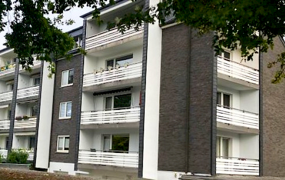 Fast ländlich an grünen Feldern liegt diese Bergische Schieferwohnanlage - mit Solarzellen zur Unterstützung der Heizung - an einem Park mit altem Baumbestand. Große Rasenflächen liegen vor den Balkonen.